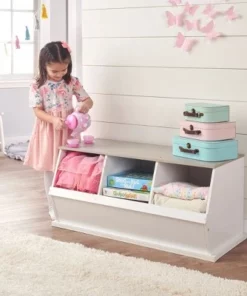 - One fixed shelf in the center and an adjustable shelf on either side accommodate storage bins and items of various sizes