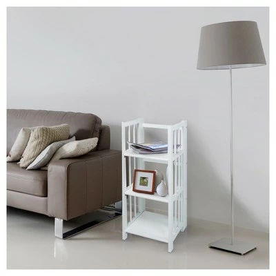 Durable beauty, this Folding Bookcase features 3 shelves and solid wood construction for lasting use. Foldable design makes transportation and storage a breeze. Perfect for apartments, dorm rooms, and home designers who love to keep things interesting. No assembly required. Wall mount hardware provided. Product dim: 14″W x 11.5″D x 38″H. Weight capacity: 25 lbs per shelf.
