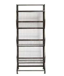 Clever and unique, the iron Clendon bin étagère works perfectly as a storage piece for kitchen, den, entry, mudroom, teenager’s room, practically anywhere. It can hold potatoes, schoolwork, gloves or whatever you want to toss in and easily access later. Even empty, the iron shelving unit with rustic finish adds interest to a room. Bins are stationary.