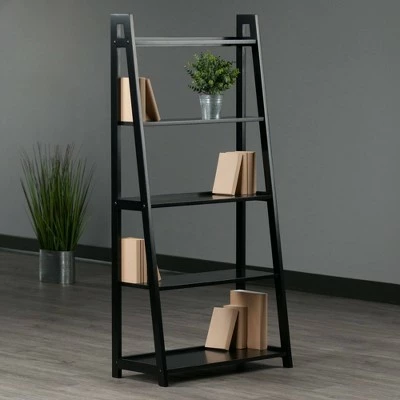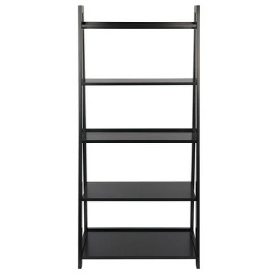 Enhance your room decor with an urban, industrial appeal with the Adam A-Frame Shelf from Winsome. with five tiers supported on a ladder-like silhouette, this decorative frame shelf brings a fresh look to your interiors, while the black finish lends a sophisticated touch to any setting. Perfect for displaying your prized book collection, this five-tier shelf provides ample space for filling it with framed photographs, decorative pieces or figurines. There are 5 total shelves of differing sizes. Overall shelf size is 27.8″W x 12.9″D x 58″H. Combine this with the Adam Desk and Corner Shelf to create a complete look. All five shelves are 26.3″W. 1st Top Shelf depth is 4.1″D, 2nd Top 6.”D, Middle 7.9″D, 4th Shelf 9.75″D and 5th Bottom Shelf 11.6″. There is a 12″ Clearance between each shelf. Made with combination of solid and composite wood in black finish. Assembly required.