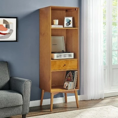 Crafted with a mid-century modern flair, the Landon Record Storage Bookcase will hold your favorite turntable and vinyl in style. A large center compartment fits your retro record player and the lower compartment is sized to house all your favorite records. Each compartment including the top display shelf, has perforated holes for cable management. The bookcase also includes a large storage drawer for smaller items. The combination of retro chic and modern function makes the Landon Record Storage Bookcase a vinyl enthusiast’s dream.