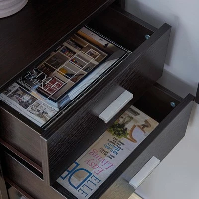 - Features: Open Shelves, Drawer(s), Anti-Tip Anchoring Hardware, Fixed Shelves, Doors