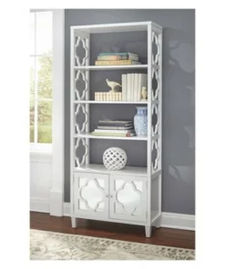The Lifestorey Broadway Bookcase in White is an expertly designed universal storage cabinet. The artful cut-out design pattern adds a delicate element to both the side panels and mirrored set of doors. Four storage shelves with cabinet space make this bookcase fashion forward and functional, perfect for showcasing your favorite decorative items.
