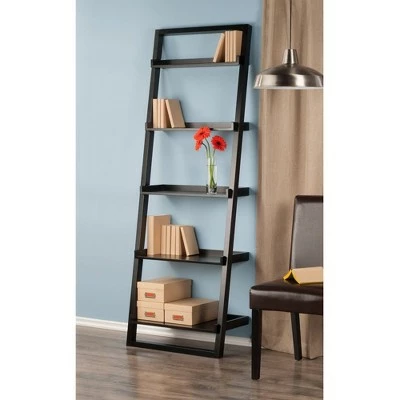 Add a chic update to your space with the 5-Shelf Leaning Bookcase from Winsome. This versatile leaning bookcase features five open shelves to store your hardcover novels, classic DVDs, family photographs, potted plants and more. Featuring a unique design with a stunning espresso finish, this decorative bookcase enlivens any wall or corner where it’s placed. The shelves range in size from 13.5 (bottom) – 4.0″ (top) deep and are 23″ wide. Constructed of wood, is sturdy, durable, and can be matched with Leaning Desk# 29330 and Airlift Stool # 93329 for a complete workstation. Overall Shelf size is 25.75″W x 14.4″D x 74.6″H. All shelves are 23″ wide with a gradual depth increase starting with the 1st Shelf = 4″, 2nd Shelf = 6.5″, 3rd 8.8″, 4th = 11.2″, 5th = 13.5″. The distance between each shelf is 14.4″. Made of solid and composite wood. Assembly required.