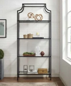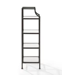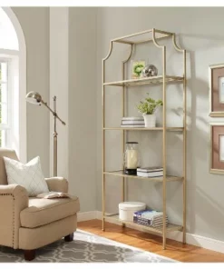 The standard bookshelf gets a serious refresh with our Crosley Aimee Étagère. Pagoda styling provides unique visual flair, while metal and glass construction compliments any room without overwhelming it. DIsplay photos, books or your favorite decor on one of the four shelves. Finished in an antique gold, the Aimee fits perfectly with any décor.