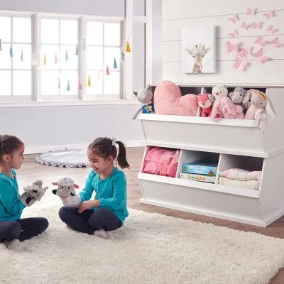 Badger Basket’s Three Bin Stackable Storage Cubby/Bin is a sturdy, modular storage solution for keeping all sorts of items tidy in any room. Features three, large, open compartments and it can be stacked with other bins to expand your storage capacity (each unit sold separately). Use for storing books, papers, media, dolls, toys, sporting goods, games, craft supplies, linens, and more! Wide mouth openings make it easy to load and unload. When you need to clean up quickly, it is a breeze to stuff everything inside! Great for kids when learning to sort and organize. Top surface offers an additional place to keep collections and trophies. Easy to clean, solid panel, smooth surface construction. Made of engineered wood with melamine lamination. Badger Basket’s Three-Bin units can mix and match with Badger’s Two-Bin and Shelf Storage units. Overall unit measures approximately 37.25 inches L x 19.25 inches W x 17.25 inches H. Each bin measures 11 inches L x 17.25 inches W x 15.75 inches H. Height from floor to top edge of front panel is 9.25 inches. Assembled weight: 33.5 pounds. All measurements approximate. Wipe clean and dry thoroughly. Adult assembly required. When stacking multiple bins, you must always use the included safety brackets to secure the units together. If stacking three or more bins high, we recommend using wall anchor/furniture safety straps (not included) to anchor the units to the wall for safety. Wall anchor straps are not included due to the many types of walls found in homes. Please consult with your local hardware retailer. Product may vary slightly from shown. Props/accessories shown are for illustration purposes only. Product complies with all currently applicable safety standards. Actual color/finish may vary from screen display. This item ships in its original carton that may include a product photo. Soft plastic/rubber toys (such as balls) can react with the finish when left in prolonged contact. Be mindful of what is stored in the unit.