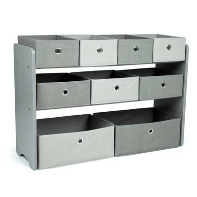 Playtime becomes more fun when your kids can easily take out their toys, books and games and then quickly clean up afterwards. The space-saving Humble Crew Toy Storage Organizer with 9 Storage Bins stows your children’s toys in easy-to-see, easy-to-access collapsible fabric storage bins. Two (2) large, three (3) medium and four (4) small storage containers are easy to remove, replace and reposition along the 3 tiered organizer shelves. Storage bins are sized just right within the toy organizer for toddlers and preschool aged children. Sturdy engineered wood construction frame with steel shelving rods, 20 pound weight capacity per level. Some assembly is required. A great toy storage box alternative; helping keep your little oneβs room clean and organized while at the same time teaching sorting and cognitive skills. Perfect organizational solution for bedrooms, nurseries, nurseries, playrooms and bathrooms.
