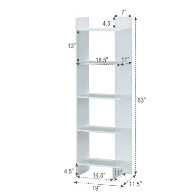 Our bookshelf which design of chic and modern style could blend well with any room interior decoration. It has 5 open shelves to provide you with plenty of storage space for books, photo frames, office supplies and decorative items. Crafted of high-quality engineered wood, this bookcase has a sturdy and durable construction to hold your daily items. In addition, versatile design makes it can be used as a room divider or a bookcase, it suits for many places, such as home office, living room or bedroom.. Specification: Color: White. Material: engineered wood. Product size: 19” X 11.5”X63” (LxWxH) . Weight capacity of each shelf: 10 lbs. Net Weight: 30.5 lbs. Package includes:. 1 X Bookshelf. 1 X Instruction.