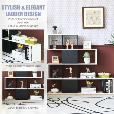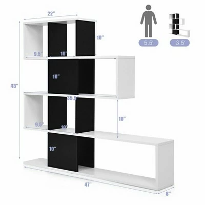 If you are looking for a piece of furniture that can decorate your room and add extra storage space, our 5-tier bookshelf is a perfect choice! With its unique ladder-shaped appearance and classic color collocation, this bookcase can fit into various furnishing styles on different occasions, such as lounge, living room, bedroom, office, etc. It is designed with 5 large open shelves, so as to greatly expand the space for storage and display. You can put your favorite collections, books and pot plants on the shelf to make your personal presentation. What’s more, with its sturdy wooden construction and anti-tipping device, the free-standing bookcase is not likely to wobble or collapse. Specification: Color: Black & White. Material: Engineered Board. Overall Dimension: 47” x 8” x 43” (L x W x H). Net Weight: 40 lbs. Shelf Height: 10”. Weight Capacity: 44 lbs (Each Shelf). Package Includes:. 1 x Bookshelf. 1 x User’s Manual.