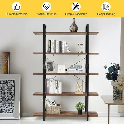 If you are looking for an ideal storage solution and want to add unique retro beauty to your living room, bedroom or study, this industrial bookshelf will do its magic! . Made of high-quality cellular board and iron, our 5-tier storage shelf is sturdy and durable for a long-time use. Equipped with anti-tip fittings, the bookcase can be anchored to the wall so as to avoid wobbling or tipping. And the x-shaped bracket at the back can reinforce its frame. This multipurpose shelf can be used as a bookcase, flower stand or display rack for holding books, photo frames, plants, etc. It can be widely used in living room, bedroom, kitchen and many other places. In addition, our easy-to-follow assembly instruction will guide you through each step! . Specification: Material: Cellular Board + Iron. Color: As the picture shows. Overall Dimension: 47” x 11” x 70” (L x W x H) . Net weight: 41 lbs. Weight Capacity of Each Shelf: 44 lbs. Package includes: . 1 x 5-Tier Bookshelf. 1 x Instruction.