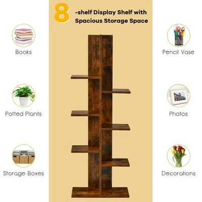 Are you looking for a versatile bookshelf to keep your daily essentials and display decorations well-organized? . Our bookshelf is your great option which is a combination of decoration and function. Thick board makes the shelf quite sturdy for durable usage. 8-tier storage shelves provides ample space for storing and displaying collections, books, photos and so on. The non-slip foot pads and anti-dumping device enhance the overall stability of bookshelf. It can be used not only as a bookcase, but also as a display shelf in the living room and plant stand in the balcony. Simple and modern design makes this bookshelf suitable for any room style and adds highlight to your home. . Specification: Color: BlackWhite. Material: Engineered Wood. Overall Dimension: 20”(L) x 8”(W) x 55.5”(H) . Height from Shelf to Ground(Left): 1”, 16.5”, 29”, 42” (H) . Height from Shelf to Ground(Right): 1”, 12”, 24.5”, 37” (H) . Net Weight: 22lbs. Weight Capacity of Each Shelf: 22lbs. Package includes: . 1 x Bookshelf. 1 x User Guide.