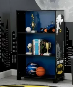 Complete your Bat cave with this DC Comics Batman Deluxe 3-Shelf Bookcase from Delta Children. The three spacious shelves are at the perfect height level to allow kids to easily store books, photos and toys. The colorful artwork of Batman and Gotham City on the side panels packs some cool style that will encourage growing super heroes to cleanup in record time. Built from sturdy wood, this durable bookcase will be able to withstand years of use, and is perfect as storage in the bedroom, playroom, living area-pretty much anywhere.