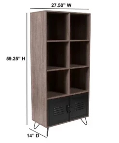 Flash Furniture Woodridge Collection 59.25″H 6 Cube Storage Organizer Bookcase with Metal Cabinet Doors and Metal Legs in Rustic Wood Grain Finish