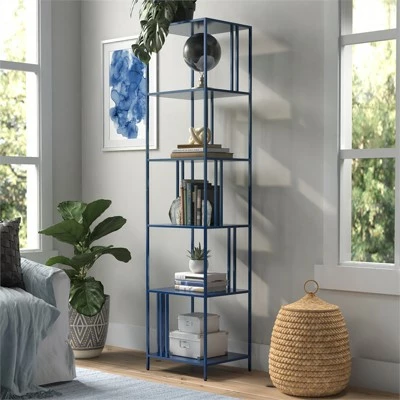 Showcase your favorite books and decorative items in this industrial-inspired 5-tier bookcase. Crafted of steel and finished in on-trend Mykonos Blue, it features staggered open shelves to add visual interest to your storage situation. Its compact footprint makes this the perfect home for your library if you’re working with a tight corner or smaller space.Features : Handcrafted finish is applied to the steel frameHandcrafted finish is applied to the steel frame.Constructed of sturdy steel.Each shelf has a weight capacity of 20 lbs.Tip-restraint hardware included.Clean with a soft, dry cloth; no harsh chemicals or abrasive cleaning materials.Specifications : Product Dimensions : 18W x 15D x 76HProduct Weight : 37.7 lbs