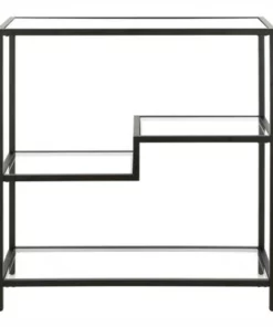 Designed to blend perfectly with your existing modern décor, this sturdy bookcase stands at 36″ tall. Its compact footprint makes this the perfect storage space if you’re working with a tight corner or smaller home office space. The geometric, staggered shelving is made of durable tempered glass, creating plenty of storage without weighing down the room visually. The four tiers allow you optimal space to display your books, pictures frames, plants and more!Features : Compact size is perfect for small spacesTabletop and shelving are made of durable tempered glassHandcrafted finish is applied to the steel frameTop and bottom shelves have a weight capacity of 30 lbs; middle shelves can support 20 lbs.Features easy assembly.Clean with a soft, dry cloth; no harsh chemicals or abrasive cleaning materials.Specifications : Product Dimensions : 34W x 14D x 36HProduct Weight : 39.9 lbs