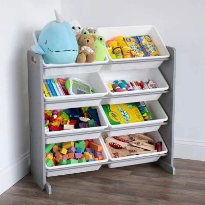 - Four tiered shelving wood toy storage organizer with 8 large plastic storage bins